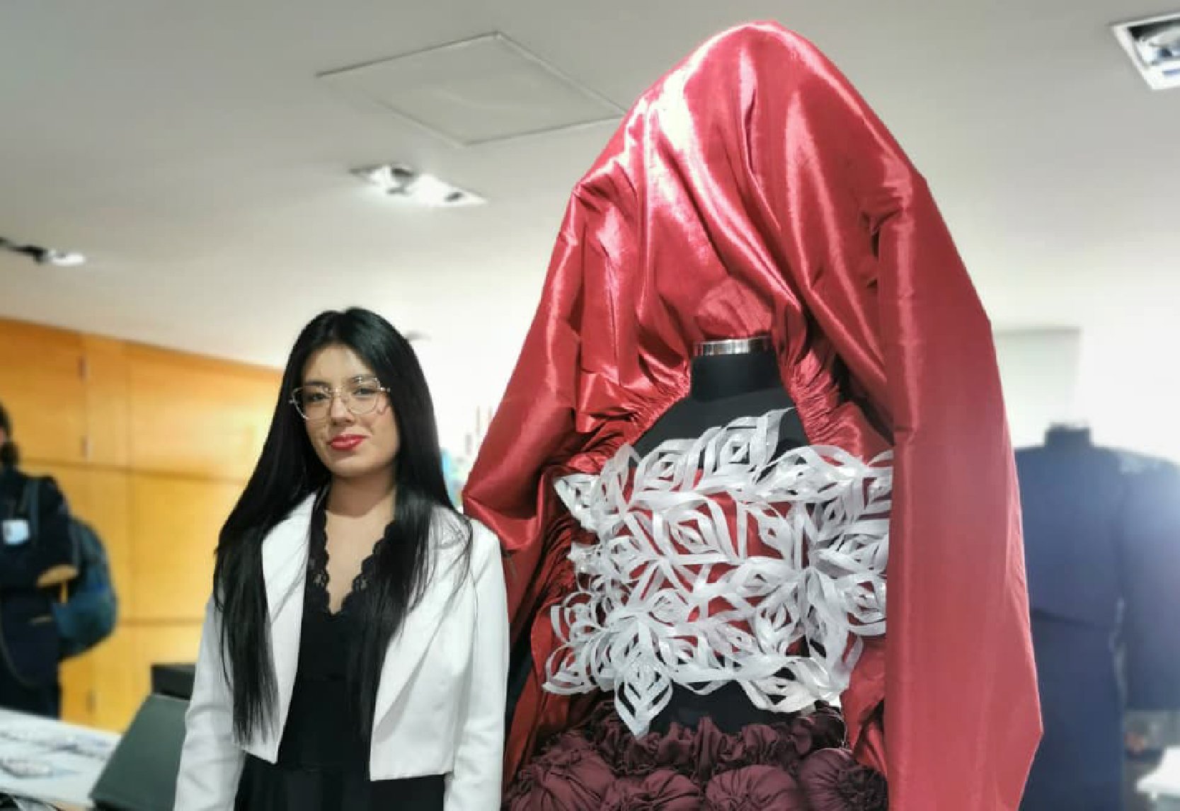 Sara Gómez - En busca de la expansión. Abordó la temática de la invisibilización de la mujer a lo largo de la historia como el caso de Lilly Reich, una de las grandes exponentes de la Bauhaus, “de manera sistemática en la bibliografía se identificó mayor reconocimiento a diseñadores masculinos , coequiperos de la artista y ella se menciona en pies de página o con el apellido”. Sara menciona la manera en que las mujeres toman una actitud de "No quiere ocupar mucho espacio", articulado con el concepto de opresión. Tomando estos referentes como inspiración, genera un indumento con un volumen magnificente en donde los colores rojo, negro y blanco toman el protagonismo así como el corpiño desarrollado con la técnica del kirigami, en plástico fusionado - una piel que deja pasar la luz sin desaparecer.
