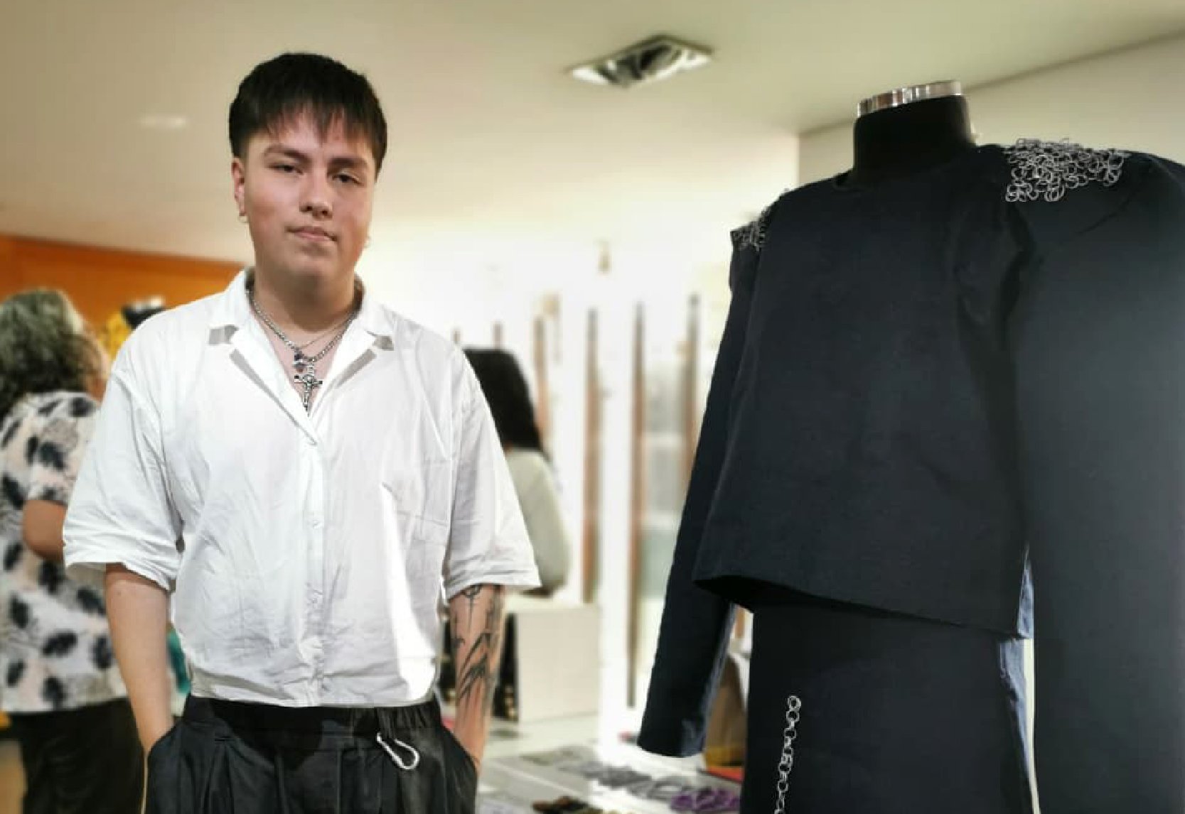 Samuel Espitia - Estructuras especiales. Generó una fusión de estilos y conceptos entre el Bauhaus y el Gótico, distintas épocas y la mezcla entre lo minimalista y lo ultra ornamental. En su análisis llevó los elementos representativos del gótico a su expresión más esencial , como: monumental haciendo alusión a las columnas. Inspirado en las armaduras medievales Samuel realizó un ornamento desarrollado con alambre, usando la técnica "Chain Made" .